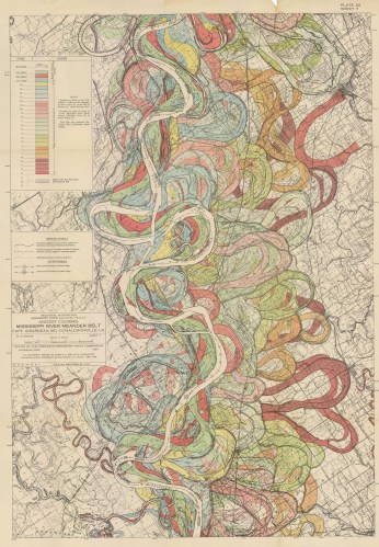 In 1944, the cartographer Harold Fisk published a series of remarkable maps of the winding historical courses of the Mississippi River as part of an otherwise technocratic report to the US Army Corps of Engineers. Each map – which can be viewed and downloaded in hi-resolution here – is like a work of modern environmental art.